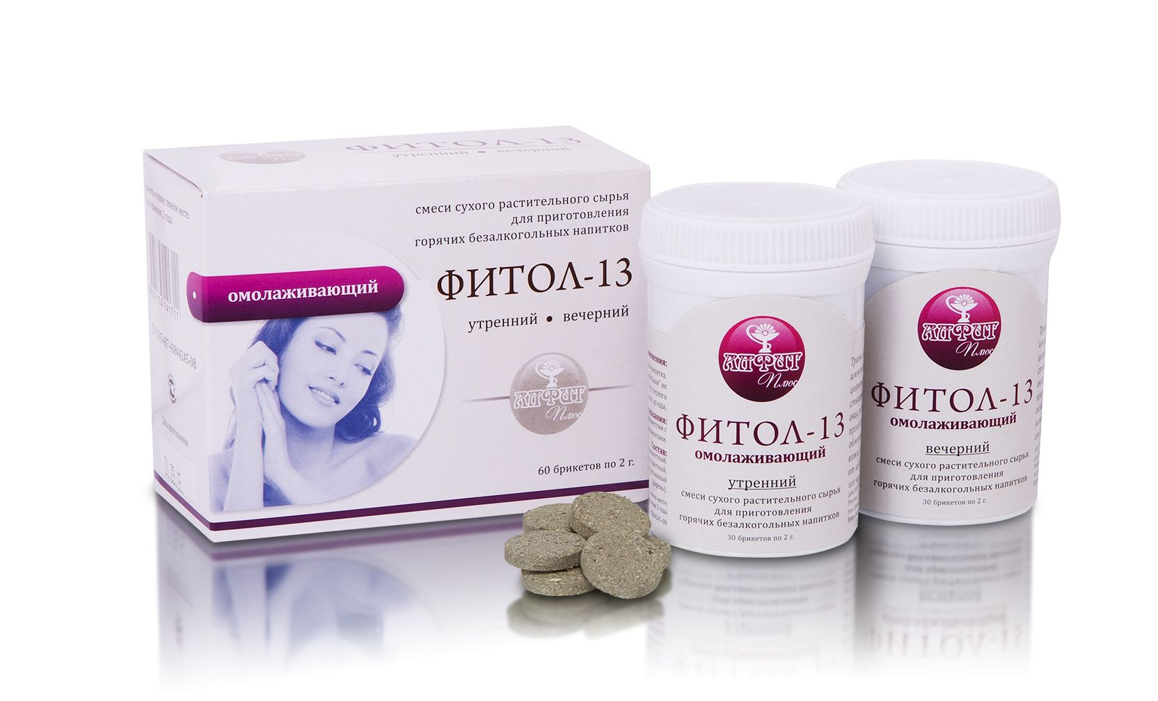 ФОРМА ВЫПУСКА - 30 брикетов по 2 грамма, упакованных в полиэтиленовые банки с захлопывающимися крышками. 1 стандарт комплектуется из 2 банок: "Фитол-13"утренний и "Фитол-13"вечерний.