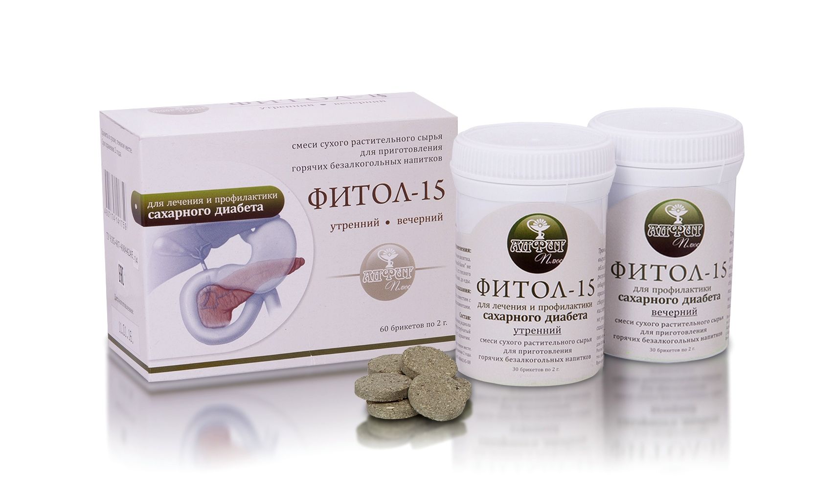 ФОРМА ВЫПУСКА - 30 брикетов по 2 грамма, упакованных в полиэтиленовые банки с захлопывающимися крышками. 1 стандарт комплектуется из 2 банок: "Фитол-15"утренний и "Фитол-15"вечерний.